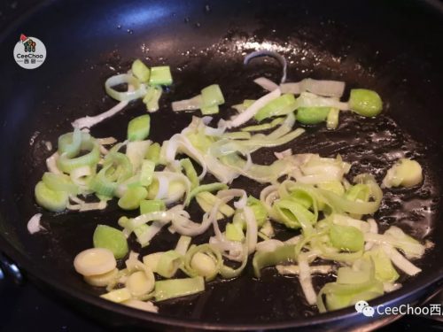 - Add butter to the pan, melt, add leek and fry for about 5 minutes.